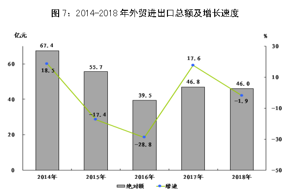 全年全市海關(guān)進(jìn)出口總額46.0億元,下降1.9%。其中,進(jìn)口額33.4億元,下降2.7%;出口額12.6億元,增長(zhǎng)0.2%。