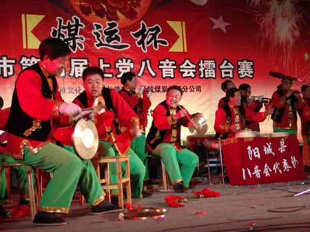 在山西省東南部晉城市六縣(市區(qū))廣為流傳。八音,即我國(guó)古代民族樂器的統(tǒng)稱,指金、石、土、革、絲、木、匏、竹八類;八音會(huì)是民間組織的音樂班子,主要使用鼓、鑼、鈸、旋、笙、簫、笛、管等八種樂器。故名八音會(huì)。
