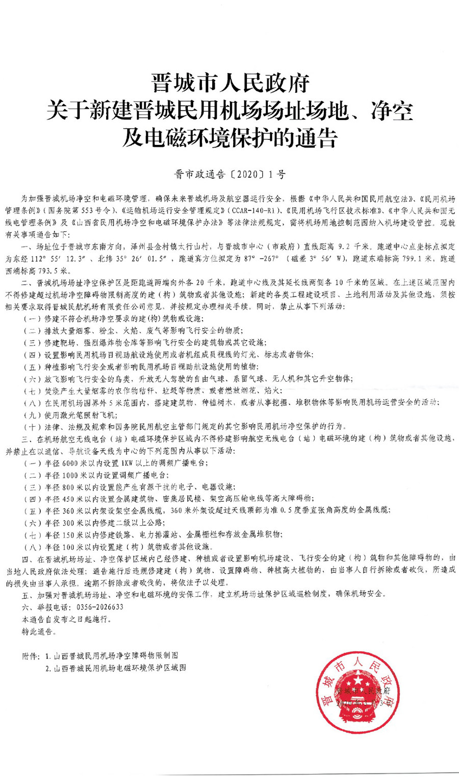 《晉城市人民政府關(guān)于新建晉城民用機(jī)場(chǎng)場(chǎng)址場(chǎng)地、凈空及電磁環(huán)境保護(hù)的通告》