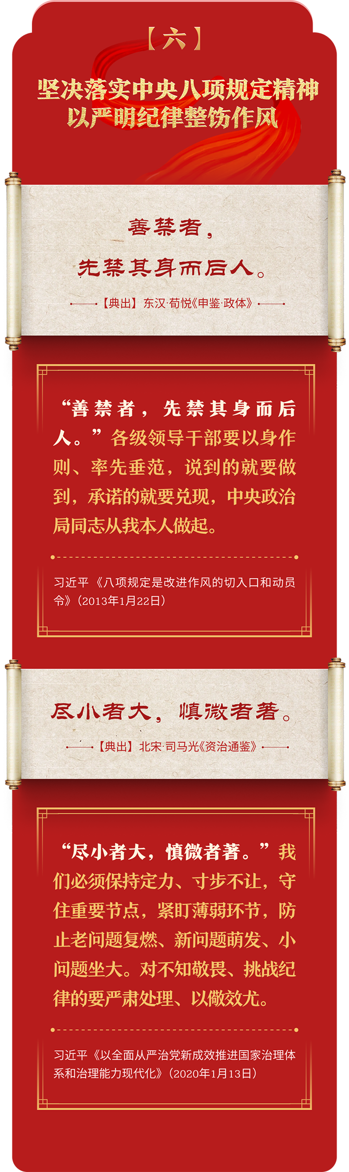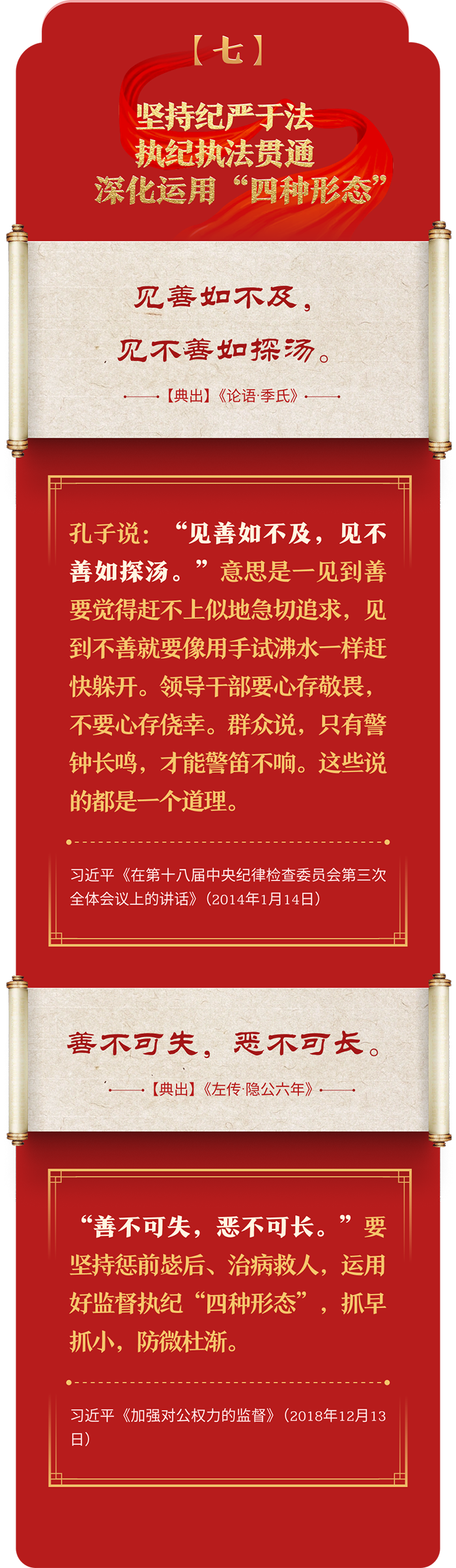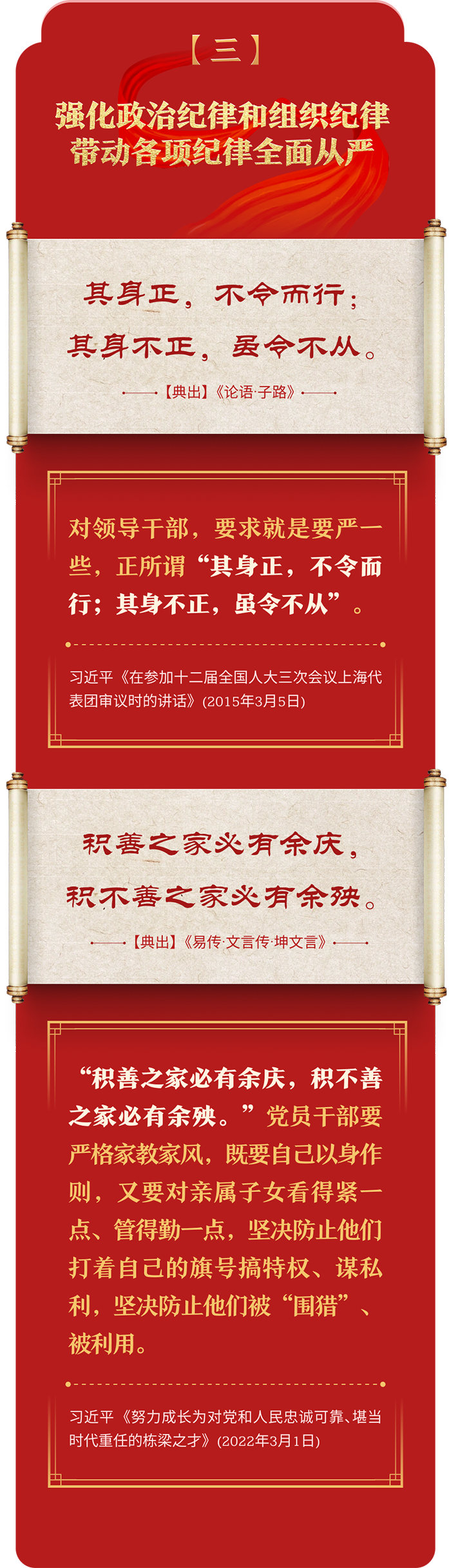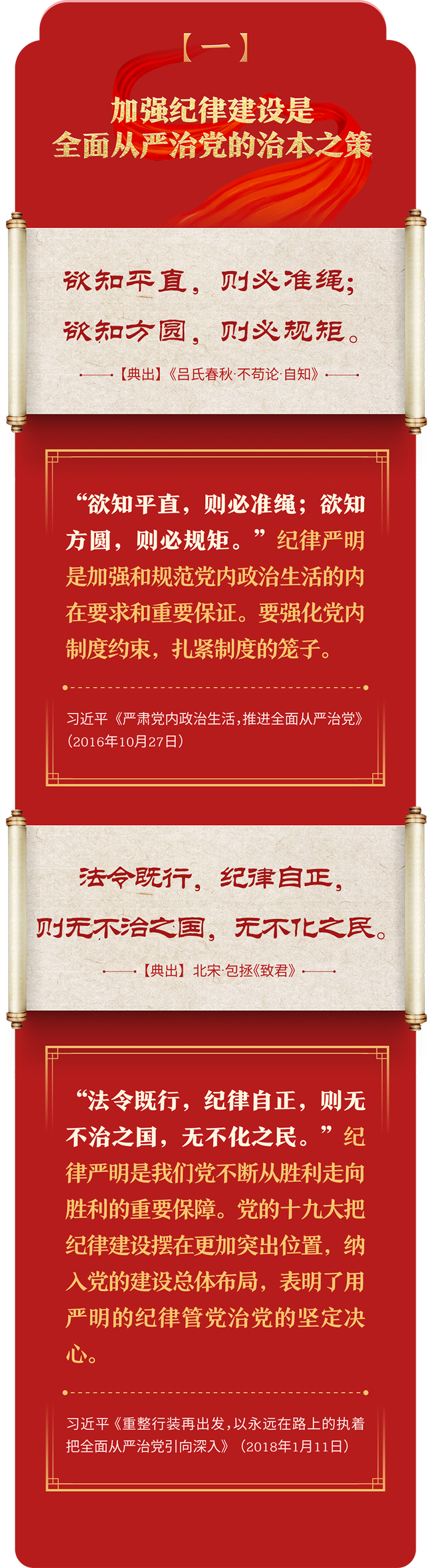 編者按:加強紀律建設是全面從嚴治黨的治本之策。黨的十八大以來,習近平總書記圍繞全面加強黨的紀律建設發(fā)表一系列重要論述,立意高遠,內涵豐富,思想深刻,引導黨員干部學紀、知紀、明紀、守紀,真正把紀律規(guī)矩轉化為政治自覺、思想自覺、行動自覺,確保全黨目標一致、團結一致、步調一致。在這些重要論述中,總書記精妙運用古代典籍經典名句,以古喻今、啟迪思想、激蕩精神,讓我們一起來學習!