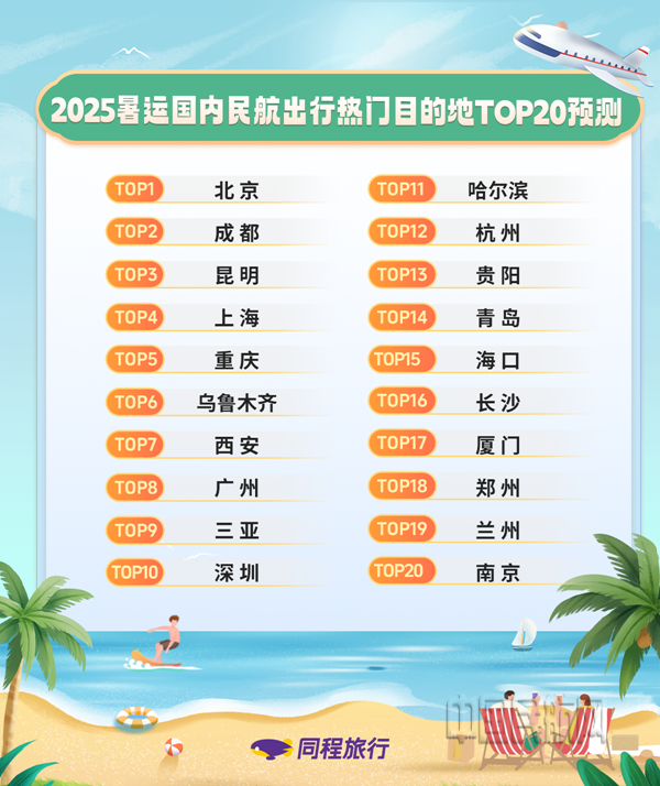 《報(bào)告》來(lái)自同程旅行平臺(tái)的暑運(yùn)機(jī)票搜索數(shù)據(jù)顯示,2025年暑運(yùn)國(guó)內(nèi)民航出行比較熱門的目的地主要有北京、成都、昆明、上海、重慶、烏魯木齊、西安、廣州、三亞、深圳等。其中,昆明和三亞的搜索熱度較2024年同期有明顯上升,烏魯木齊、西安等西部主要城市的熱度則相對(duì)穩(wěn)定。